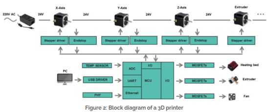 根據復雜性和可用功能,一臺3D打印機可以包含4到10個步進電機。圖2顯示了3D打印機的簡化框圖。