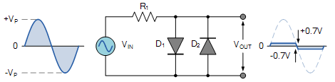 如下圖所示,當(dāng)在正半周期,并且VIN大于等于0.7V,二極管正向?qū)。此時(shí),VOUT會(huì)被鉗位在0.7V上。