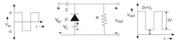 當(dāng)所加的偏壓與二極管導(dǎo)通方向一致,鉗位值會(huì)提高V1,Vout=2V+V1。
