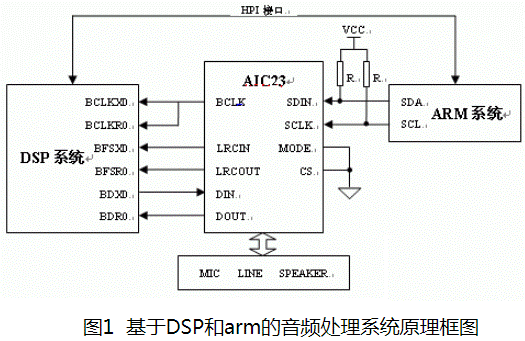 本音頻處理系統(tǒng)主要由前述三個(gè)處理芯片組成:ARM控制單元,DSP信號(hào)處理單元以及AIC23音頻采集單元。系統(tǒng)原理框圖如圖1。