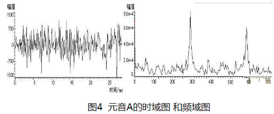 語音識(shí)別的基本原理是對(duì)語音信號(hào)進(jìn)行特征提取。目前常用的語音識(shí)別算法有基于模式匹配的動(dòng)態(tài)時(shí)間規(guī)正法(DTW: Dynamic Time Warping)、基于統(tǒng)計(jì)模型的隱馬爾柯夫模型法(HMM: Hidden Markov Model)以及基于神經(jīng)網(wǎng)絡(luò)的識(shí)別法(DNN、NPN、TDNN)等[7]。為便于系統(tǒng)應(yīng)用測(cè)試,本文采用一種最簡(jiǎn)易的方法對(duì)系統(tǒng)進(jìn)行調(diào)試,即對(duì)英文元音的識(shí)別;驹硎翘崛≡糇帜傅念l率特征,各元音在其頻域響應(yīng)中都有三個(gè)明顯的共振峰頻率,而最容易識(shí)別的是第一共振峰,由此可進(jìn)行有效的元音識(shí)別。在提取第一共振峰頻率特征時(shí)采用“零交越”法(統(tǒng)計(jì)單幀信號(hào)波形穿越零點(diǎn)的次數(shù)——過零率),將信號(hào)頻率特征的分析轉(zhuǎn)換為時(shí)域分析,計(jì)算得到的過零率與理論值進(jìn)行比較即可實(shí)現(xiàn)元音的識(shí)別。圖4所示分別為元音“A”的時(shí)域和頻域圖。