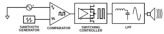 D類放大器可以簡單地描述為開關(guān)放大器或脈寬調(diào)制(PWM)放大器。下圖顯示了一個基本D類放大器的信號流程。