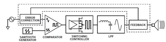 即使D類放大器具有高效率和高功率運行優(yōu)勢,某些技術(shù)仍能改善音頻質(zhì)量,例如使用反饋和預(yù)失真機制。下圖顯示了一個使用反饋機制的基本D類放大器。在反饋機制中,輸出信號(通常來自濾波器)被送至輸入端的誤差校正模塊。誤差校正模塊可以是全模擬式,或者采用數(shù)字處理故意使音頻信號預(yù)失真,從而校正輸出瑕疵并改善音頻輸出質(zhì)量。除了?揚聲器的固有非線性之外,揚聲器阻抗因為溫度和老化而變化的趨向也可能引起這種瑕疵。