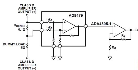 電流監(jiān)控電路可以獲取要反饋的數(shù)據(jù)進行誤差校正。選擇適合這種用途的器件的挑戰(zhàn)在于:器件必須足夠魯棒以便接收音頻放大器輸出端的高壓脈沖。AD8479可以滿足這一要求,因為即使存在高輸入共模電壓,它也能工作。電路中還加入了ADA4805-1,作為低失調(diào)、低噪聲的模數(shù)轉(zhuǎn)換器(ADC)驅(qū)動器。