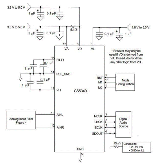 圖 1 和圖 2 分別說明了 CS5333 和 CS5340 的典型連接圖。CS5333 的模擬和數(shù)字內(nèi)核由 VA 供電,可設(shè)置為 1.8 V 至 3.3 V,并可獨立于 VA 設(shè)置。