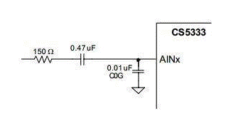 CS5333 的建議輸入濾波器拓撲如圖 3 所示。該輸入網(wǎng)絡由交流耦合電容器和單極低通濾波器組成。