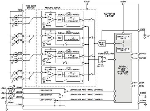 基于光電式的心率監(jiān)測方案(也稱光電容積脈搏波描記法PPG),硬件上需要有光源驅(qū)動、光電轉(zhuǎn)換、模數(shù)轉(zhuǎn)換數(shù)據(jù)處理等模塊。一般光源驅(qū)動我們選擇恒流源(需要可以微調(diào)電流和一定的頻率開關(guān));光電轉(zhuǎn)換選擇光電二極管然后用運放進行流壓轉(zhuǎn)換和信號調(diào)理;最后用A/D芯片實現(xiàn)模擬量的數(shù)字轉(zhuǎn)換并送至MCU進行處理。硬件方案如果采用分立器件,那么芯片數(shù)量較多,并且空間受限,所以最好還是采用集成器件。ADI公司擁有多功能光電式測量前端芯片(型號:ADPD105),完全集成式AFE、ADC、LED 驅(qū)動器和時序內(nèi)核, 提供一流的環(huán)境光抑制性能,無需光電二極管濾光器;靈活的數(shù)字接口SPI、I2C 可供選擇;功耗低,1.8 V模擬/數(shù)字超低工作電源,待機模式僅0.3μA電流,適合電池供電的設(shè)備;靈活的采樣頻率范圍:0.122 Hz ~3820 Hz;多達3個LED恒流源,每通道峰值電流達370mA;擁有WLCSP芯片級封裝,極致的小體積適合空間受限應(yīng)用。其內(nèi)部功能框圖如圖1。