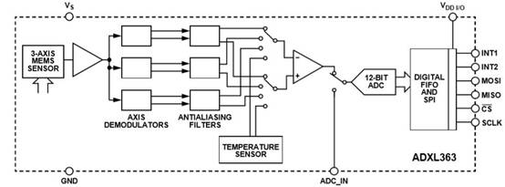 計步方案使用最多的就是三軸加速度傳感器,通過算法識別行走時的三軸動態(tài)數(shù)據(jù),即可實現(xiàn)計步功能。本方案是基于可穿戴設(shè)備,因此芯片的功耗、體積成為重要考慮因素。ADXL363是一款超低功耗的3個傳感器組合產(chǎn)品,由3軸MEMS加速度計、溫度傳感器和用于同步轉(zhuǎn)換外部信號的ADC輸入端組成。整個系統(tǒng)輸出數(shù)據(jù)速率為100 Hz時功耗低于2µA,在運動觸發(fā)喚醒模式下功耗為270 nA;1.6~3.5V工作電源范圍,便捷的兼容其他器件的電源;ADXL363還提供針對內(nèi)部ADC的訪問,可同步轉(zhuǎn)換外部的模擬輸入。緊湊型的LGA封裝非常符合可穿戴式設(shè)備應(yīng)用。其內(nèi)部功能框圖如圖2。