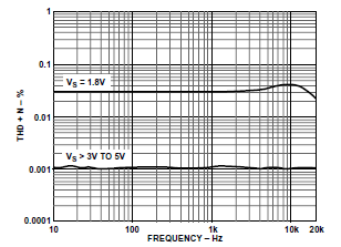 AD85x7系列的總諧波失真非常低,使該放大器成為音頻應用的理想之選。圖2所示為THD + N圖;在增益為1的同相增益配置下,VS> 3 V時,THD + N約為0.001%,VS =1.8 V時,THD + N約為0.03%。但在反相配置下,THD + N在所有額定工作電壓范圍內(nèi)均為0.001%。