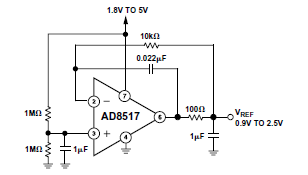 許多單電源電路被配置成偏置到電源電壓的一半。在這些情況下,可以用通過放大器緩沖的分壓器創(chuàng)建假接地基準電壓。圖3即為這種電路的電氣原理圖。兩個1 M電阻產(chǎn)生基準電壓,同時僅從1.8 V電源汲取900 nA電流。從反相端連接至運算放大器輸出端的電容提供補償,使旁路電容可以連接在基準輸出端。該旁路電容有助于為基準輸出建立交流接地。