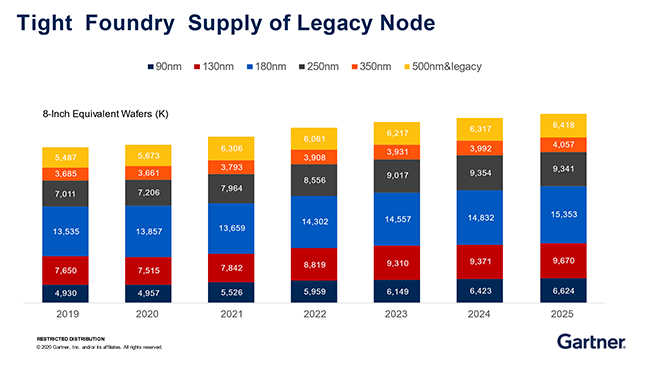 傳統(tǒng)制成大多數(shù)集中在8英寸晶圓,如今8英寸晶圓非常緊缺,源于早期8英寸建設(shè)高峰時(shí)期,過(guò)多的產(chǎn)能導(dǎo)致市場(chǎng)出現(xiàn)過(guò)剩,市場(chǎng)上長(zhǎng)期低價(jià)競(jìng)爭(zhēng),加之很多企業(yè)陸續(xù)關(guān)閉了8英寸晶圓工廠,而設(shè)備廠商陸續(xù)全線轉(zhuǎn)向12英寸,晶圓廠無(wú)法提高8英寸產(chǎn)能。此外,5G手機(jī)對(duì)PMIC、模擬電路需求量激增,大部分為8英寸晶圓,如此以來(lái),需求與產(chǎn)能的供需不平衡,導(dǎo)致8英寸制成緊缺的局面。盛陵海指出,目前8英寸產(chǎn)線沒(méi)有新廠的投資,大多數(shù)均為擴(kuò)產(chǎn),實(shí)際是為了滿足增加的迫切需求,但要徹底解決8寸制成緊缺的問(wèn)題,仍需要將8寸的產(chǎn)能轉(zhuǎn)向12寸。