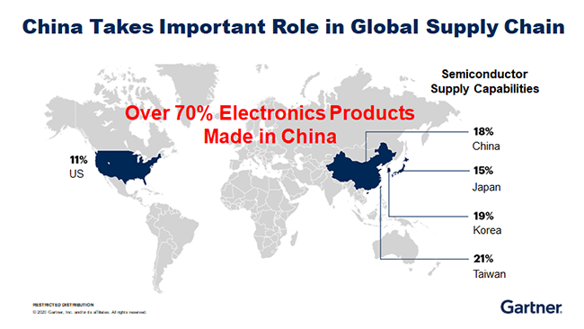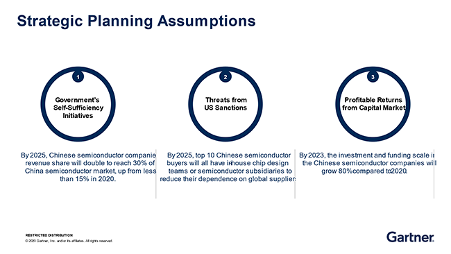 在國(guó)內(nèi)市場(chǎng)方面,中國(guó)實(shí)際上從五年前就已在半導(dǎo)體自由化方面付諸了行動(dòng)。根據(jù)Gartner的預(yù)測(cè),預(yù)計(jì)在2025年,國(guó)內(nèi)半導(dǎo)體公司市場(chǎng)份額,有望從15%突破到30%。如今的“缺芯”潮對(duì)于國(guó)內(nèi)半導(dǎo)體公司而言,創(chuàng)造了千載難逢的機(jī)會(huì)。