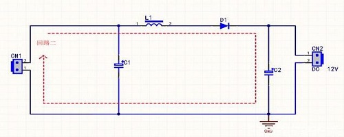 步驟二:,當(dāng)開關(guān)管斷開時候,由于電感的電流不能突變,也就是說流經(jīng)電感L的電流不會馬上變?yōu)榱,而是緩慢的由充電完畢時的值變?yōu)榱,這需要一個過程,而原來的電路回路已經(jīng)斷開,于是電感只能通過新電路放電,即電感開始給電容C2充電,電容兩端電壓升高,此時電壓已經(jīng)高于輸入電壓了,升壓過程中,電容要足夠大,這樣在輸出端就可以在放電過程中保持一個持續(xù)的電流,這兩個步驟不斷重復(fù),在輸出兩端就得到高于輸入電壓的電壓。