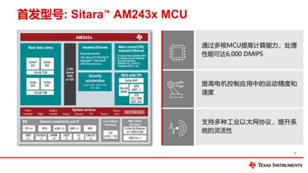 Sitara™ AM243x MCU首發(fā)型號(hào)AM2431、AM2432 和 AM2434,師總解釋說,這些型號(hào)末尾數(shù)字分別代表單核、雙核和四核。僅單核就高達(dá)800MHz的運(yùn)行頻率,四核的處理性能可達(dá)6000DMIPS,且保證功耗小于1w,這便可使工廠運(yùn)營商能夠延長電源壽命,并降低運(yùn)營成本和能耗。師總稱,這種高實(shí)時(shí)處理速度在機(jī)器人等工廠設(shè)備中至關(guān)重要,其中快速計(jì)算能力與MCU內(nèi)部存儲(chǔ)器的高速訪問可同時(shí)幫助提高機(jī)器人的運(yùn)動(dòng)精度和運(yùn)動(dòng)速度,從而提高生產(chǎn)率。額外的處理能力使設(shè)計(jì)人員能夠進(jìn)一步分析預(yù)測(cè)性維護(hù)等功能,從而減少工廠車間的停機(jī)時(shí)間。