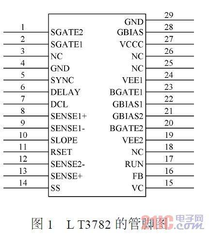 LT3782是美國(guó)凌力爾特公司生產(chǎn)的兩相步進(jìn)升壓型DC/DC控制器,28引腳SSOP封裝芯片,開(kāi)關(guān)頻率在150~500kHz之間可編程,由于采用兩相BOOST拓?fù)浣Y(jié)構(gòu)。對(duì)輸出場(chǎng)效應(yīng)管漏電流和肖特基二極管通過(guò)電流的要求都減少一半,即兩個(gè)輸出相位差180°,兩個(gè)輸出間互相抑制輸出紋波電流,輸出紋波是單相BOOST轉(zhuǎn)換電路的1/3。電源效率高,對(duì)散熱的要求小。圖1是LT3782的管腳圖,第29引腳是芯片底部的散熱腳。27引腳連接輸入電源;4引腳接地;11引腳用來(lái)設(shè)定開(kāi)關(guān)頻率;20和23BGATE引腳用來(lái)驅(qū)動(dòng)場(chǎng)效應(yīng)管的柵極;8,9,12和13SENSE引腳用來(lái)反饋場(chǎng)效應(yīng)管的輸出電流;16引腳是輸出電壓反饋引腳,該腳電壓為2.44V,通過(guò)反饋電阻可以設(shè)定輸出電壓值。17引腳是低電壓關(guān)斷引腳,當(dāng)該引腳的電壓大于2.45V時(shí),器件才開(kāi)始工作,當(dāng)該引腳的電壓小于0.3V時(shí),器件進(jìn)入低電壓關(guān)斷模式。14引腳是軟啟動(dòng)引腳,當(dāng)加電時(shí),輸出電壓從0V漸變到設(shè)定的輸出電壓值,典型的啟動(dòng)時(shí)間可以由下式計(jì)算:
