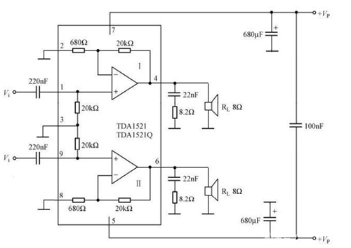 由圖可知,TDA1521 內(nèi)包含兩個功率放大器,分別用于兩個聲道的功率放大。其中1、2、4 引腳分別為一個功率放大器的反相輸入端、同相輸入端、輸出端;9、8、6 引腳分別為另一個功率放大器的反相輸入端、同相輸入端、輸出端。