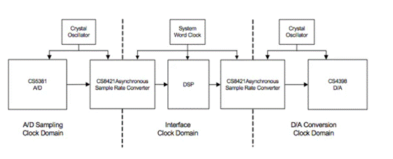 另一種方法是創(chuàng)建一個系統(tǒng)架構(gòu),其中 A/D 和 D/A 轉(zhuǎn)換節(jié)點在獨立于網(wǎng)絡(luò)或系統(tǒng)時鐘域的本地時鐘域內(nèi)運(yùn)行。使用采樣率轉(zhuǎn)換器 (SRC) 可以輕松實現(xiàn)具有獨立時鐘域的系統(tǒng),如圖 1 所示。該架構(gòu)還允許轉(zhuǎn)換過程以固定采樣率運(yùn)行,該采樣率始終高于網(wǎng)絡(luò)或接口采樣率。這種方法的基本優(yōu)點是轉(zhuǎn)換過程不受接口時鐘抖動的影響,并由本地?zé)o抖動晶體振蕩器控制。