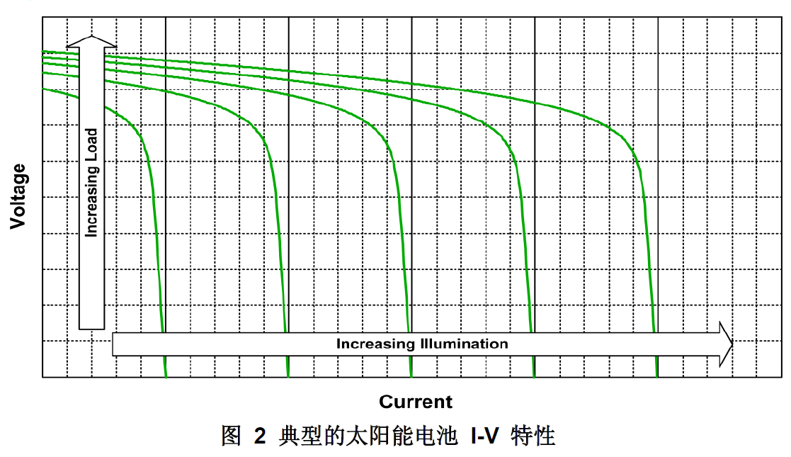 電流源IPH會產(chǎn)生一個和太陽能電池上的光量度成正比的電流。在沒有負載連接的情況下,幾乎所有產(chǎn)生的電流均流經(jīng)二極管D1,其正向電壓決定了太陽能電池的開路電壓(VOC)。該電壓會因不同類型太陽能電池的特性不同而有所差異,但是,對于大多數(shù)硅電池而言,這一電壓都在0.5V~0.6V之間(這也是p-n結二極管的標準正向電壓)。在實際太陽能電池應用中,并聯(lián)電阻RP的漏電流很小。隨著負載電流的增加,IPH產(chǎn)生的大部分電流從二極管中流出來并進入負載。對于大多數(shù)負載電流而言,這個過程對于輸出電壓僅有很小的影響。由于二極管的I-V特性會有輕微的變化,并且由于串聯(lián)電阻RS的原因(其具有連接損耗)電壓會稍有下降,但輸出電壓卻保持大體恒定。然而,有時流經(jīng)D1的電流太小,從而導致二極管偏置不夠,并且二極管兩端的電壓會隨著負載電流的增加而急劇下降。最后,如果所有產(chǎn)生的電流均只流經(jīng)負載(而不流經(jīng)二極管),則輸出電壓就會變?yōu)榱。這個電流被稱為太陽能電池的短路電流(ISC)。ISC和VOC都是定義太陽能電池工作性能的主要參數(shù)之一。