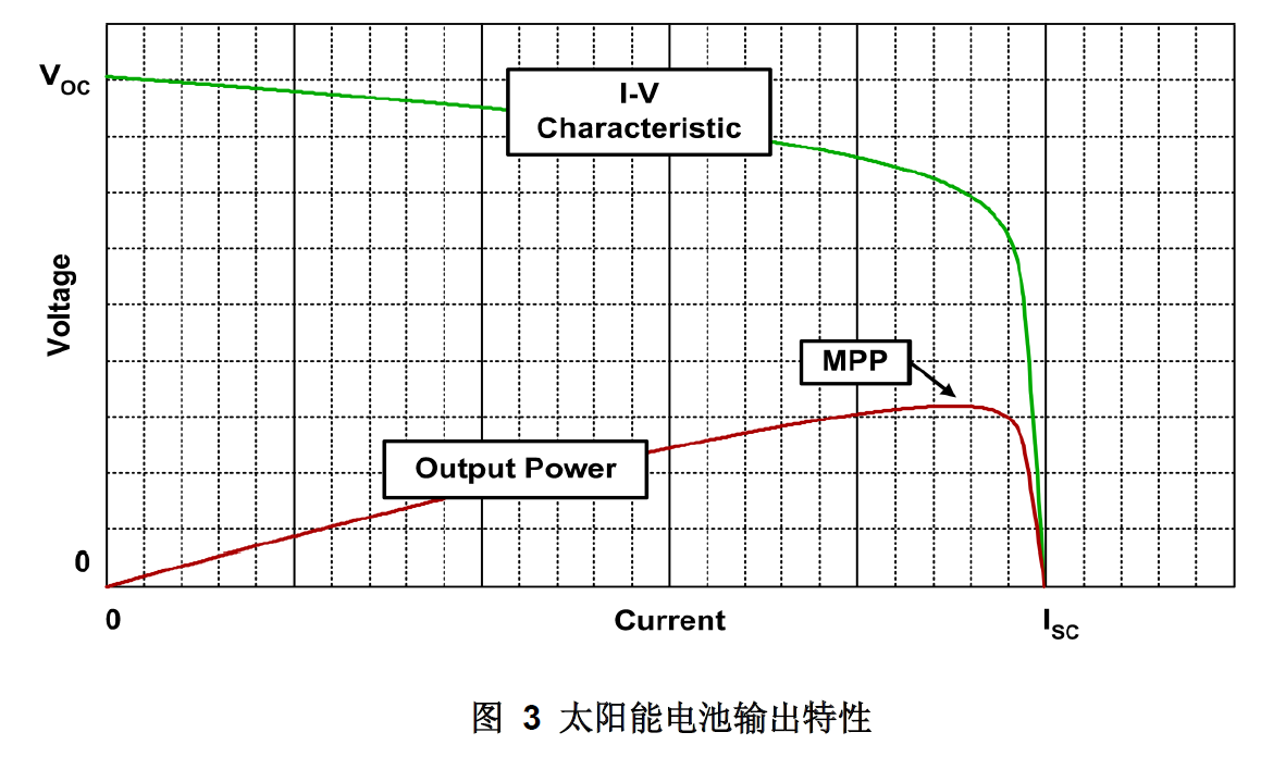在大多數(shù)應用中,人們都期望太陽能電池能提供盡可能多的電能。由于輸出功率是輸出電壓和電流的乘積,因此就必須確定電池工作區(qū)域中的哪一部分所產(chǎn)生的VI值最大。這一點被稱為最大功率點(MPP)。當輸出電壓為其最大數(shù)值(VOC)時,輸出電流為零,這是一個極端情況;而當輸出電流達到最大值(ISC),但輸出電壓為零時,則是另一種極端情況。在這兩種情況下VI的乘積均為零,因此,這兩種極端情況肯定都不是MMP點。我們可以很容易證明(或通過實驗進行觀察),在任何應用中,MPP一般會出現(xiàn)在太陽能電池輸出特性(請參見圖3)下半部分的某個位置。但問題是太陽能電池MPP的確切位置會因入射光線和環(huán)境溫度不同而變化。所以,設計旨在動態(tài)地調(diào)節(jié)太陽能電池的輸出電流,以達到太陽能電量生成系統(tǒng)的最大化,以便在實際應用中其能夠在MPP點或者其臨近點工作。