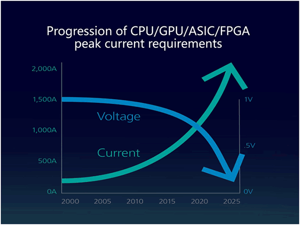 人工智能時代是追求算力的時代,然而算力的提升伴隨的便是電流迅速的增長,而另一方面電壓則是緩慢下降的過程。下圖可見,2020到2021年,CPU、GPU、ASIC、FPGA等AI芯片的耗電明顯上升,2021年AI芯片供電電流已達(dá)1200A,電壓約達(dá)0.7、0.8V。Vicor高級現(xiàn)場應(yīng)用工程師楊周解釋說,這是因為代工巨頭臺積電、中芯國際都在提升晶圓的制程,由原來的12nm到3nm,晶體管的數(shù)量增多,單位面積加大,所帶來的便是電流的增長,損耗的增加,當(dāng)制程越小時,晶體管承受的電壓越低,意味著XPU計算效率就會降低。這種趨勢為電源設(shè)計帶來極大的挑戰(zhàn)。Vicor是如何應(yīng)對低電壓大電流需求所帶來的挑戰(zhàn)呢?