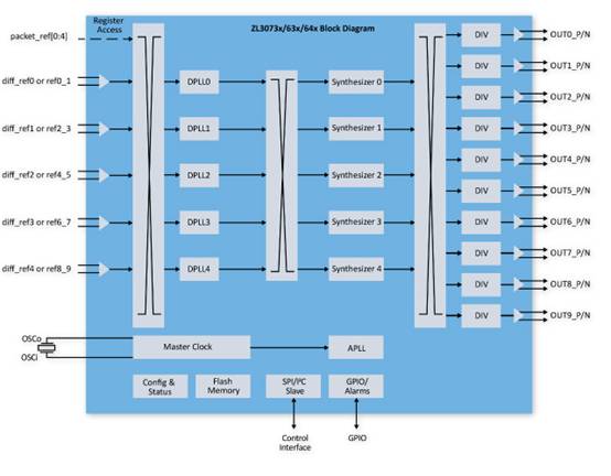 這款最新平臺(tái)配備五個(gè)超低抖動(dòng)合成器,可提供最新的5G RU、DU和CU系統(tǒng)的高速接口所需的100飛秒(fs)均方根(rms)抖動(dòng)性能。