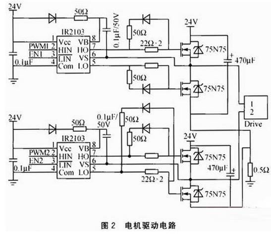 Q1、Q4和Q2、Q3分別組成兩個橋路,分別控制電機的正轉和反轉。高端驅動的MOS管導通時源極電壓和漏極電壓相同且都等于供電電樂VCC,所以要實現(xiàn)MOS管正常的驅動,柵極電壓要比VCC大,這就需要專門的升壓芯片IR2103?刂破鳟a(chǎn)生的PWM信號輸入HIN引腳,控制器I/O口輸出的 EN1、EN2作為使能信號。輸出端HO就可得到比VCC要高的電壓,且高出的電壓值正好是充在電容兩端的電壓。二極管提高導通速度,使得75N75的導通電阻更小,降低了開關管的損失。同時IR2103的兩個輸出口HO、LO具有互鎖功能,防止由于軟件或硬件錯誤造成的電機上下橋臂直通造成短路。