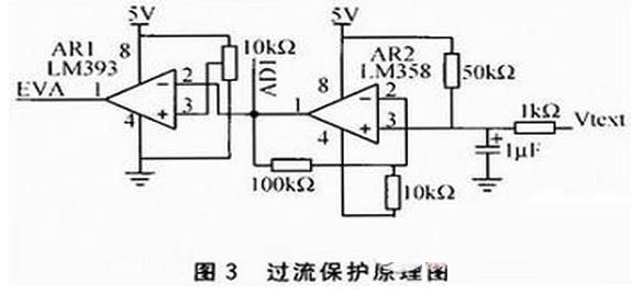 在電機控制系統(tǒng)中安裝過流保護有兩方面的意義:一是防止在電機正常運行時,電機出現(xiàn)超載或堵轉而使得電樞繞組電流過大損害電機甚至引發(fā)火災;另一方面是由于電機肩動時啟動電流很大,往往不能直接啟動,既需要等勵磁繞組逐漸建立磁場后再正常運行,又希望電機以盡量快的速度肩動起來。有了過流保護對電流進行斬波,可以使電機安全快速地啟動。過流保護原理圖如圖3所示。