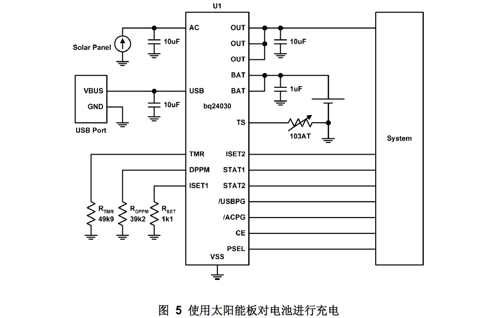 bqTINY-III還允許通過USB端口對電池進行充電。在這種情況下,Q3就會被用來調(diào)節(jié)輸入電流,以確保USB規(guī)范可根據(jù)IC的ISET2引腳狀態(tài)滿足100mA或500mA的要求。如果系統(tǒng)和充電電流的總和超過了所選USB的電流極限,則VOUT就會下降且DPPM功能會降低充電電流,或像從前那樣還原為電池補充模式。bqTINY-III系列器件的另一個非常有用的特性就是如果充電器正處于DPPM狀態(tài),則其內(nèi)部安全定時器就會自動延長時間。因此在低光照或電流限制的條件下,當電池充電速度較慢時,在出現(xiàn)錯誤條件之前對電池進行再充電所允許的時長得到了適當?shù)难娱L,從而避免了過早的充電終止。