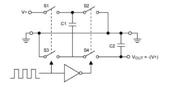 閉合S1和S3會在前半個周期將飛跨電容器C1充電至V +。在下半部分,S1和S3打開,S2和S4關(guān)閉。此動作將C1的正極連接到地,并將負(fù)極連接到VOUT。C1然后與儲能電容器C2并聯(lián)。如果C2兩端的電壓小于C1兩端,則電荷從C1流到C2,直到C2兩端的電壓達(dá)到-(V +)。