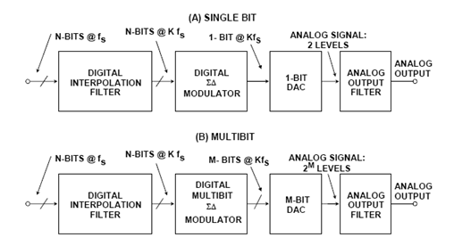 Σ-Δ型DAC的工作原理與Σ-Δ型ADC非常相似,但在Σ-Δ型DAC中,噪聲整形功能是利用數(shù)字調(diào)制器實(shí)現(xiàn)的,而不是利用模擬調(diào)制器。