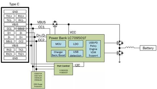 為了支持PD的所有功能,包括使用VDM的快速充電,移動(dòng)電源制造商將需要轉(zhuǎn)向設(shè)計(jì)一個(gè)智能控制器來提供通過USB PD提供的功能。例如安森美半導(dǎo)體的LC709501F。這高度集成的基于Flash的可配置設(shè)備匯集了所需的所有功能,通過多個(gè)USB接口管理鋰離子電池提供的電源。圖2所示為一個(gè)典型的應(yīng)用示例。