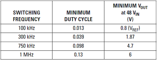 最小可控“導(dǎo)通”時間限制是DC/DC轉(zhuǎn)換器IC的一個特點,其為脈寬調(diào)制(PWM)電路的最窄可達脈寬。在降壓轉(zhuǎn)換器中,開關(guān)周期期間功率MOSFET導(dǎo)通的時間百分比被稱作占空比,其等于輸出電壓與輸入電壓的比。使用TPS54160轉(zhuǎn)換器時,占空比為0.104(4 V/48 V),而數(shù)據(jù)表中列出的最小“導(dǎo)通”時間為130 ns?煽孛}寬限制產(chǎn)生一個最小可達占空比,而用最小“導(dǎo)通”時間乘以開關(guān)頻率,我們可以輕松地計算出該占空比的大小。一旦知道了最小占空比,利用VIN乘以最小占空比,我們便可以計算出最低可達輸出電壓。最低輸出電壓同樣也受轉(zhuǎn)換器基準電壓的限制,使用TPS54160時其為0.8V。