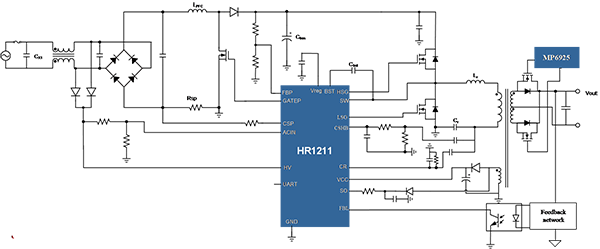 MPS AC/DC的另一款成名之作HR1211,也充分地體現(xiàn)了MPS的產(chǎn)品優(yōu)勢,這是一款集成多模式PFC和電流型LLC的二合一控制器。芯片集成了高壓電流源、安規(guī)認(rèn)證的X電容放電電路、PFC和LLC的高壓驅(qū)動電路,從而實現(xiàn)了非常簡潔的外圍電路。