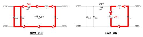SW1為高邊開關(guān),SW2為低邊開關(guān)。SW1導(dǎo)通(SW2為OFF)時(shí),電流路徑是從輸入電容器到SW1、再經(jīng)由電感L到輸出電容器。SW2導(dǎo)通(SW1為OFF)時(shí),電流路徑是從SW2經(jīng)由L再到輸出電容器。下圖表示這些電流路徑的差分,每當(dāng)開關(guān)ON/OFF時(shí),紅色線路的電流都會(huì)急劇變化。該環(huán)路的電流變化非常劇烈,所以會(huì)因PCB板布線電感而在環(huán)路內(nèi)會(huì)產(chǎn)生高頻振鈴。