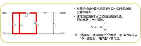 在開關(guān)時(shí)會(huì)產(chǎn)生急劇電流ON/OFF的環(huán)路中,會(huì)因寄生分量產(chǎn)生高頻振鈴=開關(guān)噪聲。