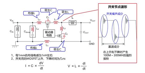 圖中表示構(gòu)成電源電路的外置部件、實(shí)裝多層電路板的寄生分量及振鈴的關(guān)系。