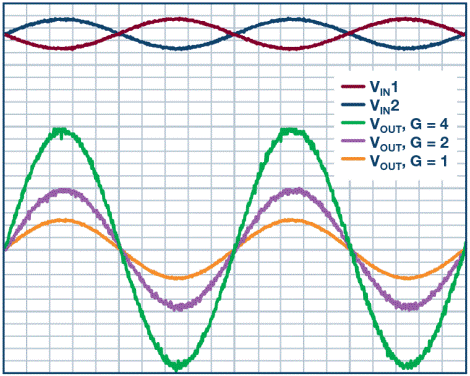 圖2顯示的是施加差分輸入電壓和電路增益變動的情況。RF值可設(shè)置系統(tǒng)增益?梢钥吹,這張圖顯示的是系統(tǒng)增益1、2和4,且1kHz時的差分輸入電壓為1Vp-p。