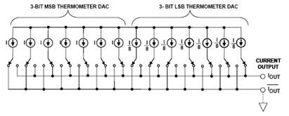 圖4:基于兩個(gè)3位溫度計(jì)DAC的6位電流輸出分段DAC