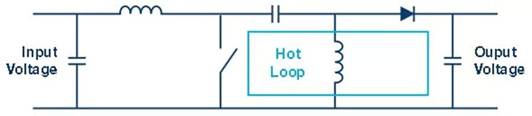 為了創(chuàng)建一個輻射干擾盡可能低的優(yōu)化電路板布局,開關(guān)模式穩(wěn)壓器的熱回路必須盡可能小—也就是說,寄生電感越小越好。為了說明快速開關(guān)電流產(chǎn)生的影響,我們針對一個示例進行了計算。如果在一納秒內(nèi)開關(guān)1 A電流,且該電流路徑中存在20 nH 的寄生電感,則會產(chǎn)生20 V電壓偏移。計算公式如下: