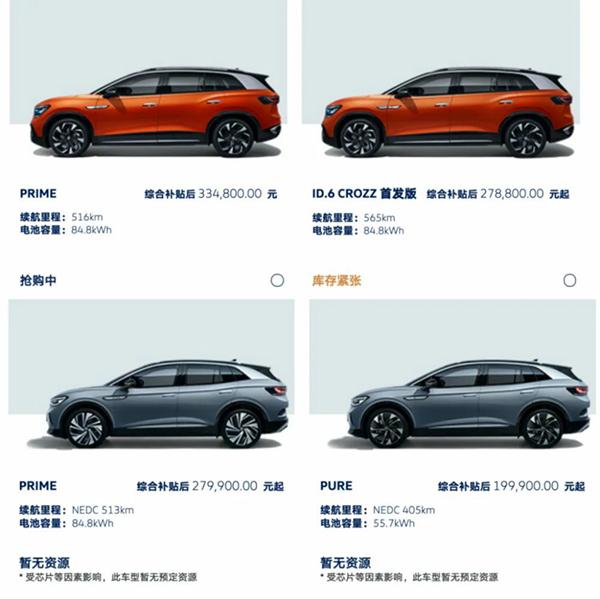 除了 ID.4 CROZZ 外,ID.6 CROZZ 的部分車型在官網(wǎng)上顯示的交付時間為 1-3 個月,其中售價為 23.98 萬元的最低配車型預(yù)計在 2022 年 3 月交付,而售價為 27.88 萬元的首發(fā)版官網(wǎng)上顯示庫存緊張。
