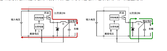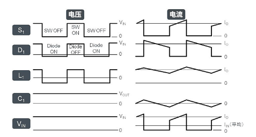 與基準(zhǔn)電壓進(jìn)行比較,檢查輸出電壓是否為設(shè)定電壓低于設(shè)定電壓時(shí),開(kāi)關(guān)變?yōu)镺N,從輸入向輸出供電。此時(shí),電感會(huì)蓄積磁能,如果輸出電壓高于設(shè)定電壓,則開(kāi)關(guān)OFF電感所蓄積的磁能變?yōu)殡娏鞅还┩敵鲐?fù)載,再返回電感電感的磁能消失,輸出電壓開(kāi)始下降時(shí),開(kāi)關(guān)會(huì)再度為ON實(shí)際電流及電壓的開(kāi)關(guān)波形也有記載。S1為MOSFET的開(kāi)關(guān)晶體管、D1為肖特基二極管、L1為電感、C1為輸出電壓、VIN為輸入電壓。