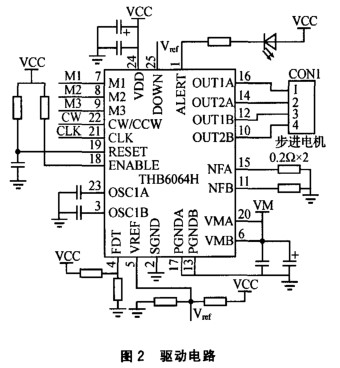 驅(qū)動(dòng)電路以步進(jìn)電機(jī)驅(qū)動(dòng)芯片THB6064H為核心,配合簡(jiǎn)單的外圍電路實(shí)現(xiàn)步進(jìn)電機(jī)的驅(qū)動(dòng)。驅(qū)動(dòng)電路如圖2所示。