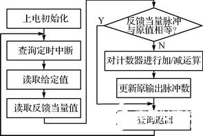 本文的步進(jìn)電機(jī)閉環(huán)控制方法采用核步法。核步法的控制思想是從簡(jiǎn)化控制系統(tǒng)出發(fā),利用核步計(jì)數(shù)器對(duì)系統(tǒng)位置進(jìn)行跟蹤監(jiān)視,即時(shí)發(fā)出反饋控制信號(hào),從而完成對(duì)位置的控制。其基本原理如圖1所示。單片機(jī)接收來自上位機(jī)的時(shí)序脈沖信號(hào)和方向信號(hào),經(jīng)驅(qū)動(dòng)放大后送往步進(jìn)電機(jī)來控制步進(jìn)電機(jī)工作;步進(jìn)電機(jī)帶動(dòng)編碼器同軸旋轉(zhuǎn),由編碼器檢測(cè)轉(zhuǎn)角度,并以脈沖的形式反饋到單片機(jī)進(jìn)行核步計(jì)數(shù);單片機(jī)根據(jù)脈沖反饋當(dāng)量值與給定值進(jìn)行比較,按照核步算法發(fā)出控制指令。如果發(fā)生丟步,單片機(jī)就會(huì)根據(jù)差值繼續(xù)發(fā)送脈沖,把丟掉的步數(shù)補(bǔ)上,從而完成步進(jìn)電機(jī)轉(zhuǎn)動(dòng)位置的閉環(huán)控制。