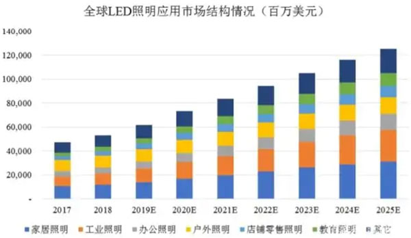 從應用場景看,家居照明、工業(yè)照明、戶外照明、辦公照明、店鋪零售照明、教育照明等是LED照明的主要應用場景。