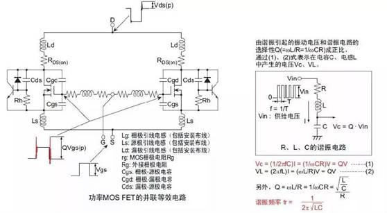 在并聯(lián)功率MOSFET時(shí)未插入柵極電阻而直接連接時(shí)發(fā)生的柵極寄生振蕩。高頻率反復(fù)接通、斷開漏極—源極電壓時(shí),在由柵極—漏極電容Cgd(Crss)和柵極引腳電感Lg形成的諧振電路上發(fā)生此寄生振蕩。當(dāng)諧振條件(ωL=1/ωC)成立時(shí),在柵極—源極間外加遠(yuǎn)遠(yuǎn)大于驅(qū)動(dòng)電壓Vgs(Vin)的振動(dòng)電壓,由于超出柵極—源極間額定電壓導(dǎo)致柵極破壞,或者接通、斷開漏極—源極間電壓時(shí)的振動(dòng)電壓通過柵極—漏極電容Cgd和Vgs波形重疊導(dǎo)致正向反饋,因此可能會(huì)由于誤動(dòng)作引起振蕩破壞。