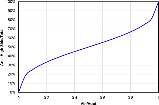 通過圖 1,我們知道 50% 轉(zhuǎn)換比率時(shí)出現(xiàn)最佳傳導(dǎo)損耗極值。但是,在其他轉(zhuǎn)換比率條件下,可以將損耗降至這一水平以下。附錄 1 給出了進(jìn)行這種優(yōu)化的數(shù)學(xué)計(jì)算方法,而圖 2 顯示了其計(jì)算結(jié)果。即使在極低的轉(zhuǎn)換比率條件下,F(xiàn)ET 芯片面積的很大一部分都應(yīng)該用于高側(cè) FET。高轉(zhuǎn)換比率時(shí)同樣如此;應(yīng)該有很大一部分面積用于低側(cè)。這些結(jié)果是對這一問題的初步研究,其并未包括如高側(cè)和低側(cè)FET之間的各種具體電阻值,開關(guān)速度的影響,或者對這種芯片面積進(jìn)行封裝相關(guān)的成本和電阻等諸多方面。但是,它為確定 FET 之間的電阻比提供了一個(gè)良好的開端,并且應(yīng)會在FET選擇方面實(shí)現(xiàn)更好的整體折中。