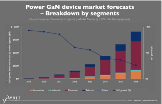 預(yù)計(jì) 2021 年 GaN 功率器件收入將達(dá)到 1 億美元左右。但隨著 GaN 器件供應(yīng)商尋求進(jìn)入其他市場(chǎng)以提高產(chǎn)量,預(yù)計(jì)到 2026 年這一數(shù)字將激增至 10 億美元,其中EV/HEV市場(chǎng)將是重點(diǎn)。