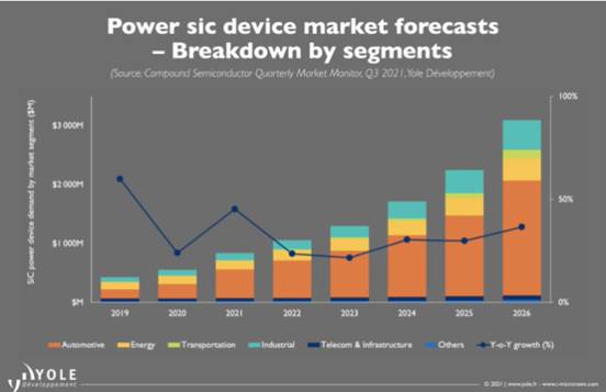 在過(guò)去的幾十年中,SiC(碳化硅)和GaN(氮化鎵)技術(shù)都呈現(xiàn)快速發(fā)展,并且正在被各行業(yè)所接受,有著廣闊的市場(chǎng)前景。第一個(gè)商用 SiC 器件是德國(guó)英飛凌公司2001年推出的肖特基二極管。預(yù)計(jì)到2026 年,工業(yè)市場(chǎng)相關(guān)需求有望超過(guò) 40 億美元。