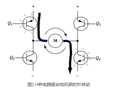 要使電機運轉(zhuǎn),必需使對角線上的一對三極管導(dǎo)通。例如,如圖2所示,當Q1管和Q4管導(dǎo)通時,電流就從電源正極經(jīng)Q1從左至右穿過電機,然后再經(jīng)Q4回到電源負極。按圖中電流箭頭所示,該流向的電流將驅(qū)動電機順時針轉(zhuǎn)動。當三極管Q1和Q4導(dǎo)通時,電流將從左至右流過電機,從而驅(qū)動電機按特定方向轉(zhuǎn)動(電機四周的箭頭指示為順時針方向)。