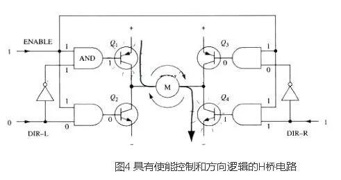 采用以上辦法,電機的運轉(zhuǎn)就只需求用三個信號控制:兩個方向信號和一個使能信號。假如DIR-L信號為0,DIR-R信號為1,并且使能信號是1,那么三極管Q1和Q4導(dǎo)通,電流從左至右流經(jīng)電機(如圖5所示);假如DIR-L信號變?yōu)?,而DIR-R信號變?yōu)?,那么Q2和Q3將導(dǎo)通,電流則反向流過電機。